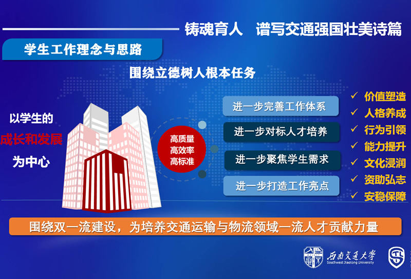 交运学院员工工作组紧紧围绕党的教育方针,认真落实立德树人根本任务,全面贯彻党的十九大和十九届二中、三中、四中、五中全会精神,以及全国教育大会、全国高校思想政治工作会议和学校思想政治理论课教师座谈会精神,不断增强“四个意识”、坚定“四个自信”、做到“两个维护”,以党建和思想政治工作的一流带动各项工作。按照“一个核心、两向引导、三类能力、四重文化、多方协同”总体设计,在员工思想政治教育实践中深根细作,真抓实干,着力提升思想政治工作实效,着力搭建多维促能平台,着力完善立体学风育人体系,着力培育学院优秀文化,着力打造员工管理工作闭环,着力构建多方协同的“大学工”工作格局,努力践行“三全育人”理念。员工工作和员工工作队伍建设成绩显著,十九大以来历年荣获校员工工作考核一等奖,荣获就业工作一等奖,获评五四红旗团委,社会实践队获团中央、团省委表彰,曾获评全国五一巾帼标兵先进岗和四川省老员工思想政治教育先进集体。
